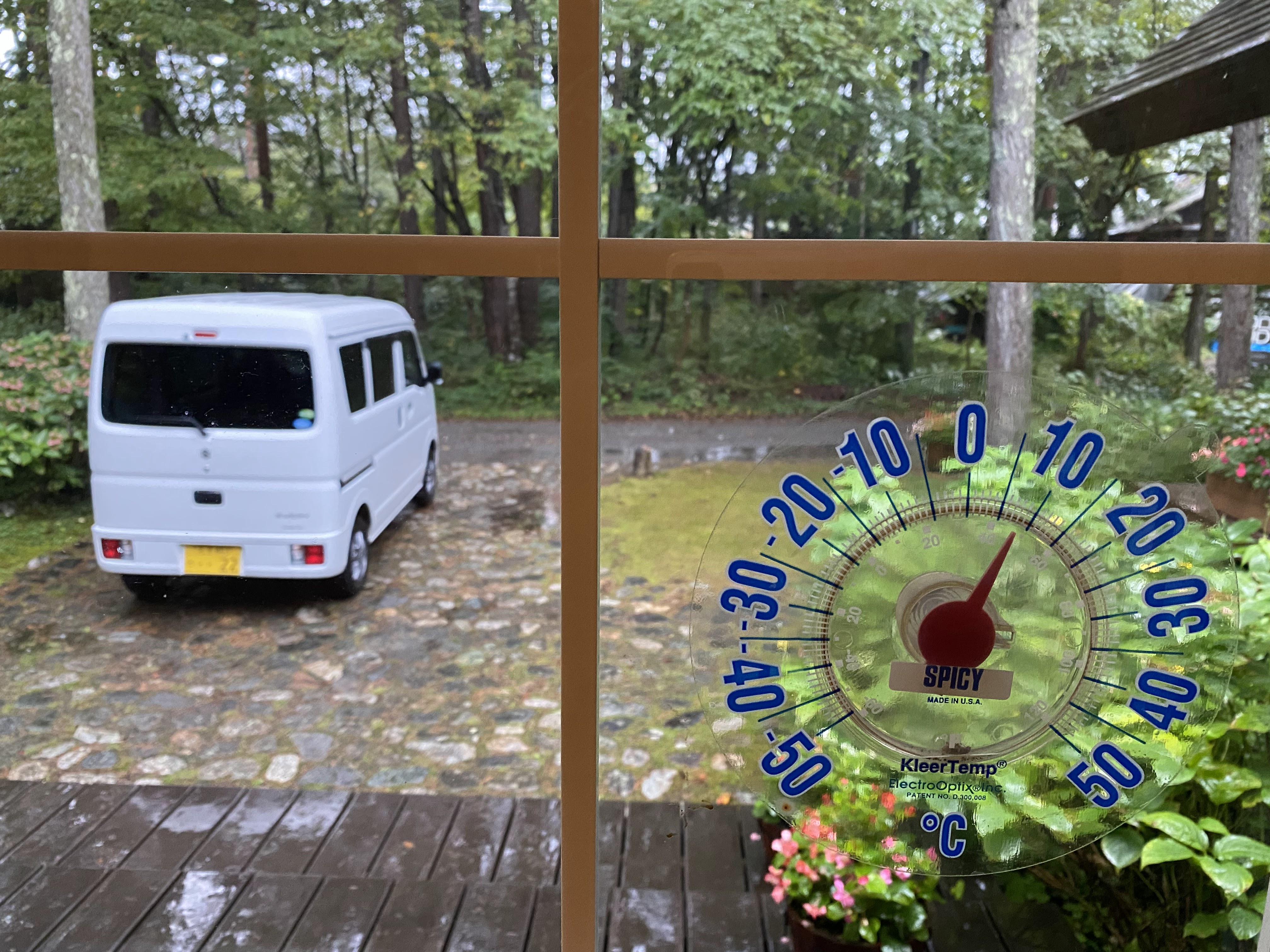 I had phoned ahead to see if a small restaurant was open, and it was. Riding there it started to rain lightly, nothing to worry too much about. But about 1 min after arriving and sitting in the warm room , rain started to pour down. While I ate my Curry rice and an extremely tasty tomato salad (of local tomatoes), the rain stopped and even a shy sun was making some intermittent appearance.